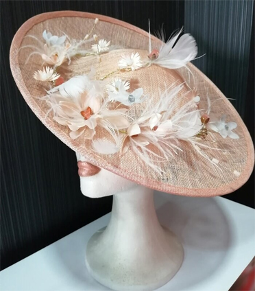 Pamela «Luna» hecha a mano en Sinamay rosa Nude, con decoración en unas, flores y piedras alabranda en alambre dorado. Elige el color y te la realizo a tu gusto, si necesitas asesoramiento contacta conmigo.